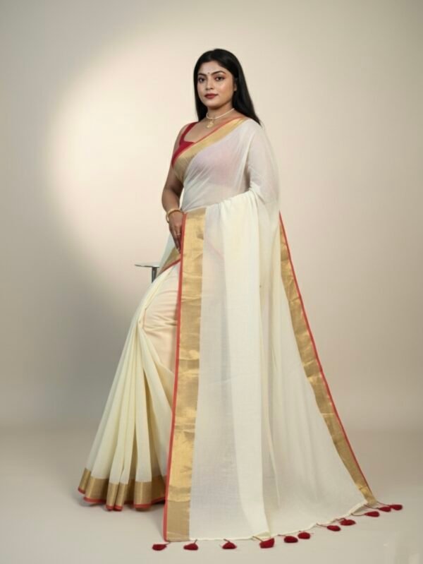 Masraize cotton plain saree is a soft, breathable handloom drape known for its smooth texture and elegant simplicity. Crafted from fine cotton yarns, it offers exceptional comfort and a graceful fall, making it ideal for both daily wear and formal occasions. Its minimalist charm highlights timeless beauty and effortless style.